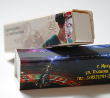 Ваши клиенты останутся довольны этим сувениром на память, а рекламное воздействие от него во много раз превосходит эффект простой визитной карточки из-за функциональности спичек.
