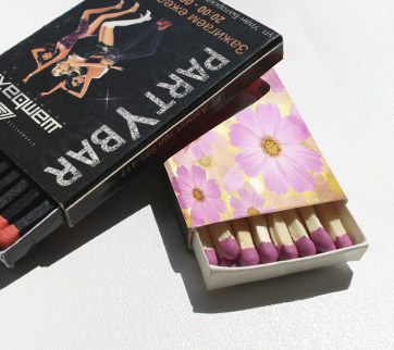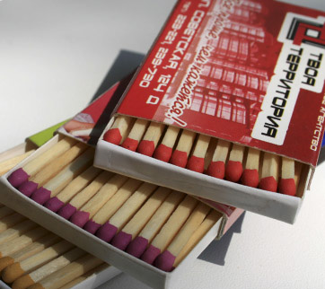 - По желанию заказчика в работе могут быть использованы цветная головка спички, дизайнерский картон, индивидуальная форма коробка, тиснение изображения и текста фольгой, черное древко.